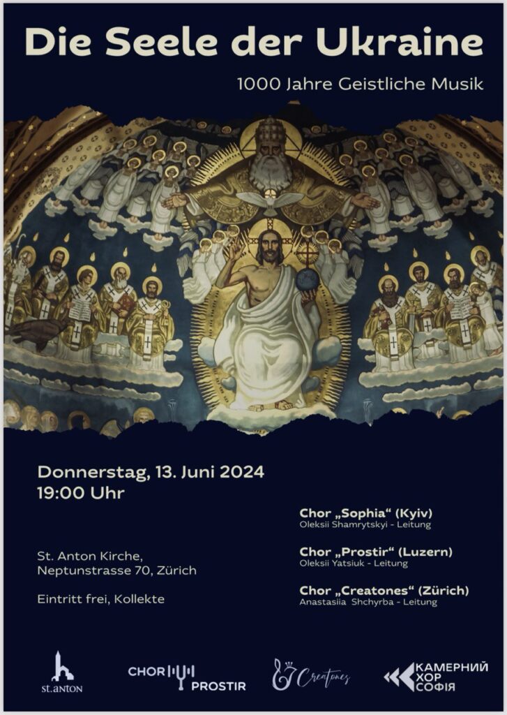 Es treten die Chöre “Creatones” (Zürich) und “Prostir” (Luzern) auf, die seit 2022 ukrainische Musik dem europäischen Publikum präsentieren.
