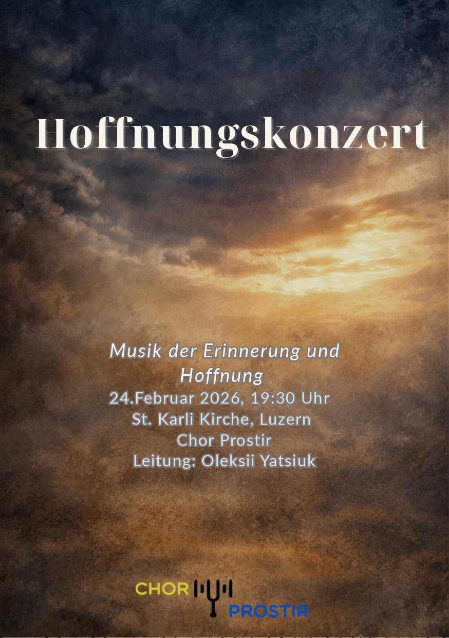 Weihnachtskonzert in Basel! 3. Dezember um 19:00, Theodorkirche Basel Der ukrainische Chor „Prostir“ lädt zum Adventskonzert «Lichter der Hoffnung» ein –mit traditionellen ukrainischen und europäischen Weihnachtsliedern, warmen Klängen und festlicher Stimmung. Ort: Theodorkirche, BaselEintritt frei – Kollekte Ein Abend zum Innehalten, Zuhören und Mitfühlen.Herzlich willkommen!